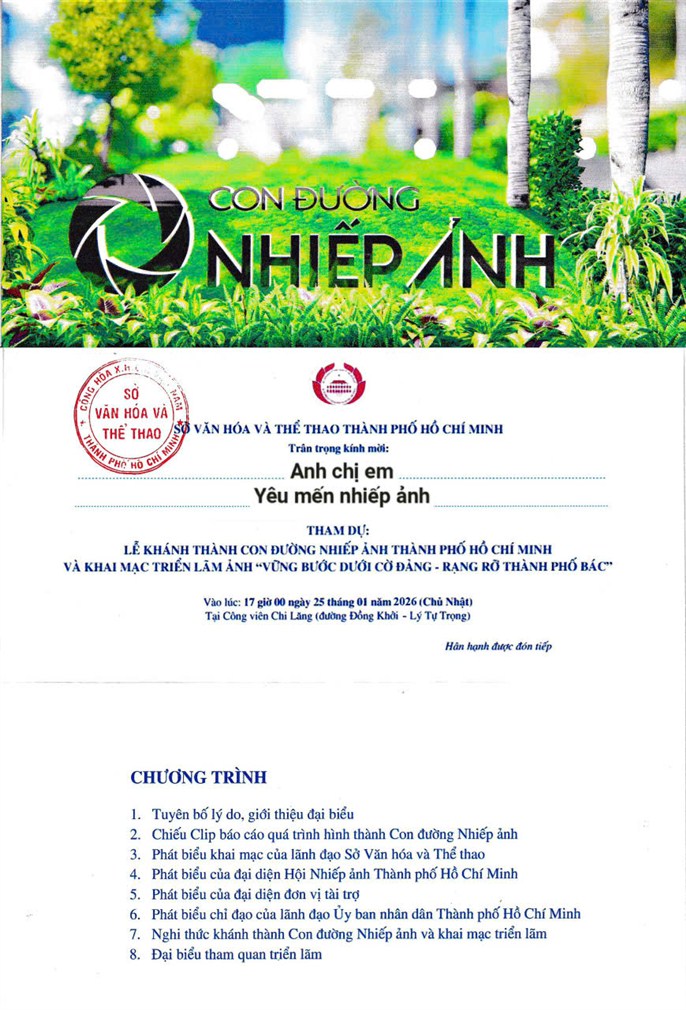 Hòa trong niềm vui chung chào mừng thành công Đại hội Đảng toàn quốc lần thứ XIV, vào lúc 17 giờ chiều nay ngày 25/1/2026, TP Hồ Chí Minh long trọng tổ chức Lễ khánh thành Con đường Nhiếp ảnh TP Hồ Chí Minh – một công trình văn hóa nghệ thuật có ý nghĩa đặc biệt, xứng tầm thế kỷ, lần đầu tiên tôn vinh nhiếp ảnh Thành phố một cách quy mô, bài bản và bền vững.