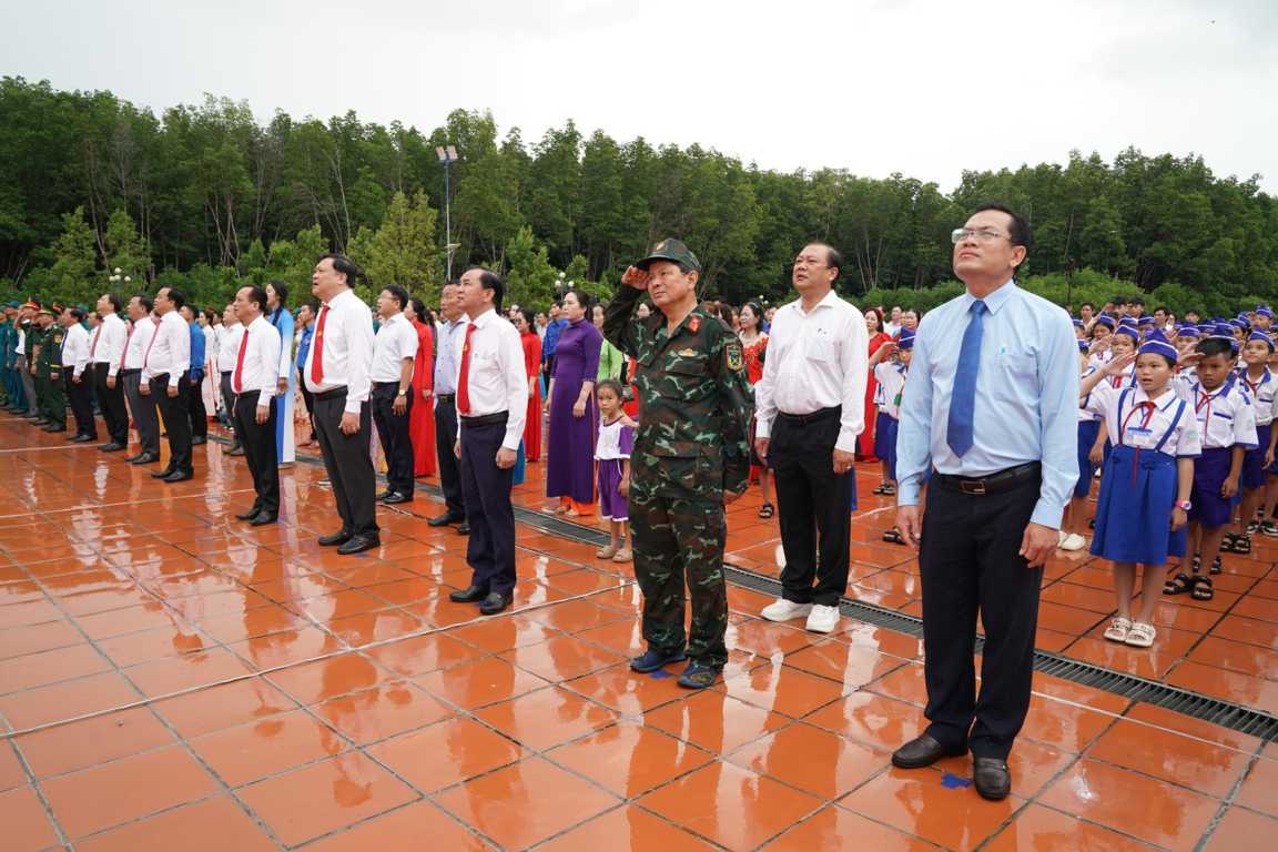 Không khí trang nghiêm mà ấm áp, giữa rừng đước bạt ngàn và biển trời xanh biếc, tiếng Quốc ca vang lên như hòa cùng sóng gió thiêng liêng của Tổ quốc.